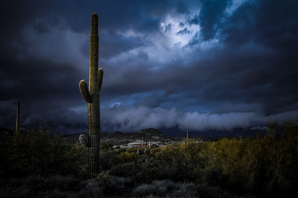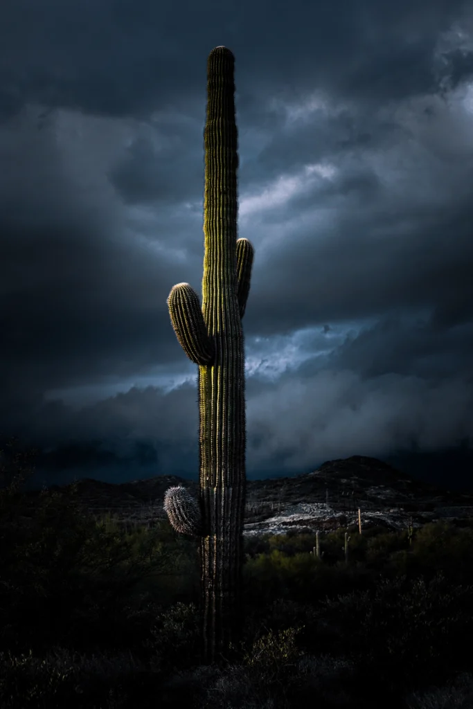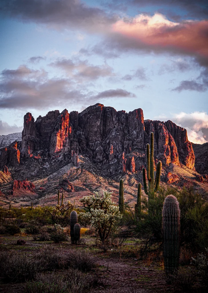 Years after moving away from Arizona, I returned with my camera as dark clouds settled low over the Supers and the last light ignited the rock underneath. The mountains glowed warm against a heavy sky, that deep copper red I grew up watching.